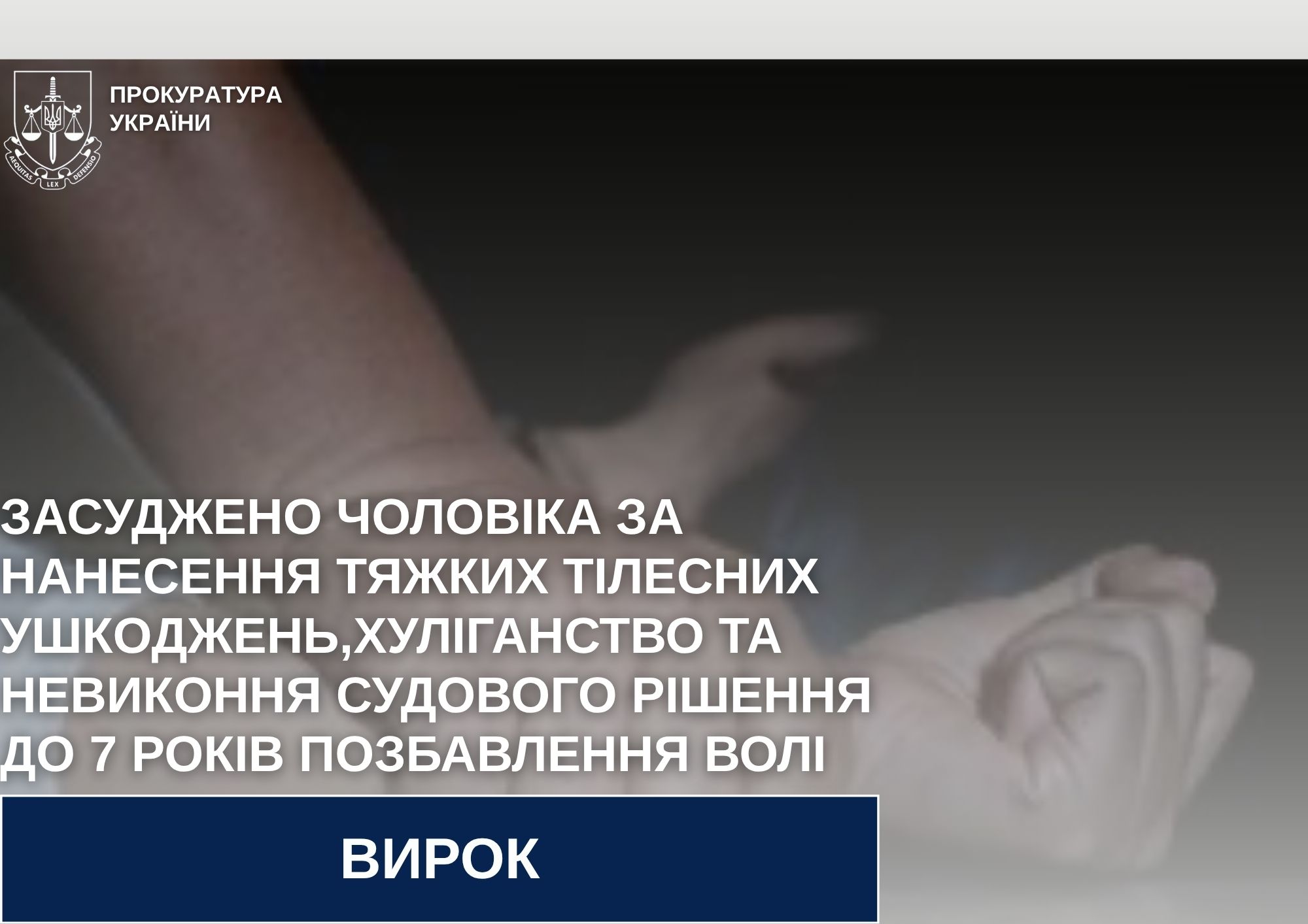 Засуджено чоловіка за нанесення тяжких тілесних ушкоджень, хуліганство та невиконання судового рішення до 7 років позбавлення волі